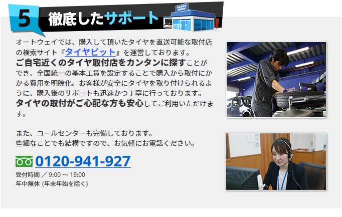 通信販売のお店ですが、自宅の最寄りのタイヤ取付協力店でタイヤの取付をしてもらえます。