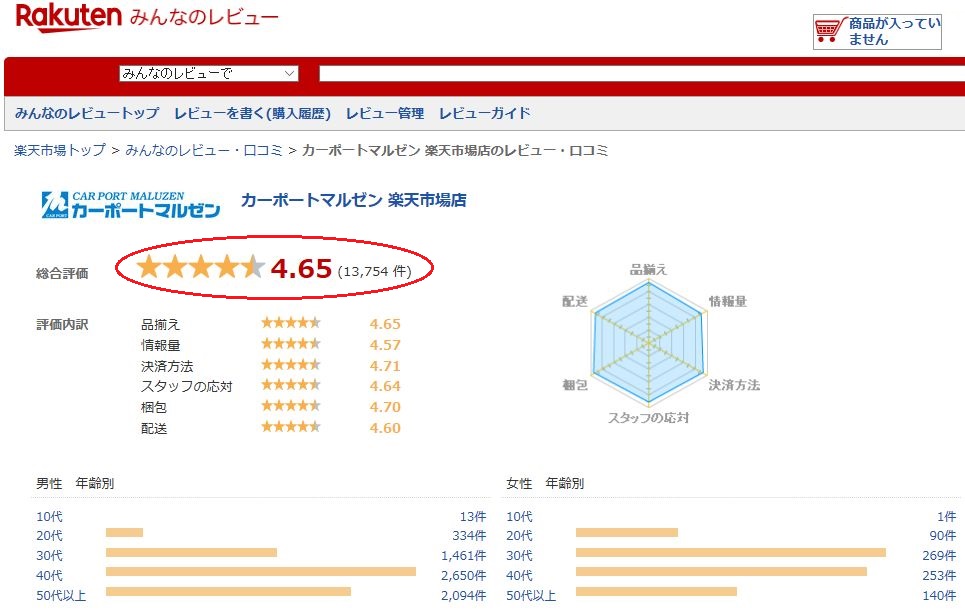 カーポートマルゼンの評判を見てみると、楽天市場だけでも13,000人以上が利用していて5点満点中4,65点とかなり高評価されています。