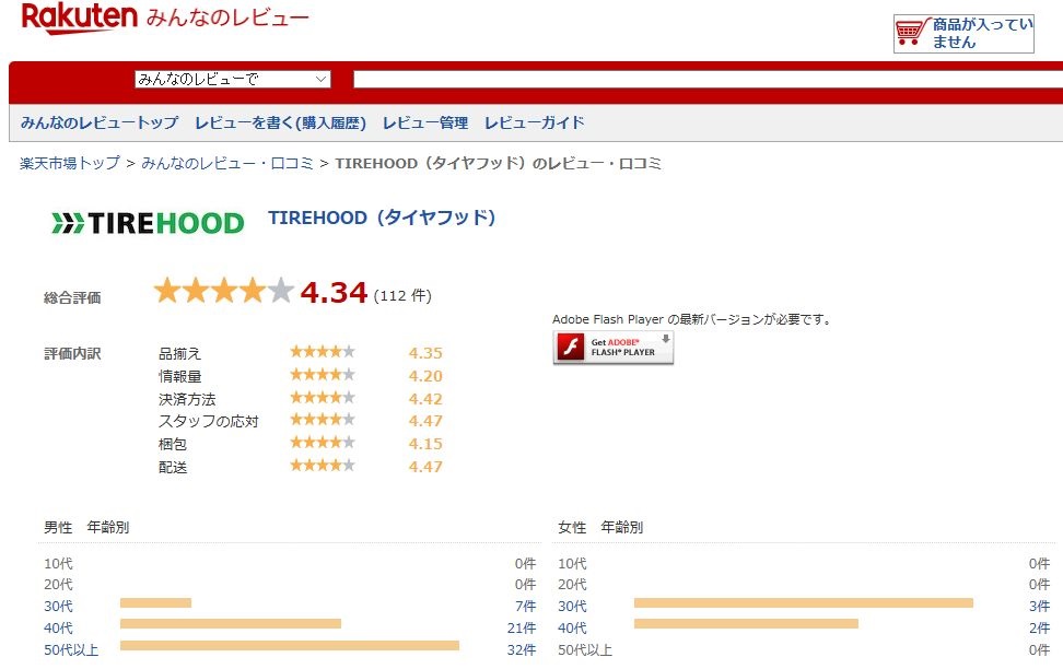 タイヤフッド(TIREHOOD)の楽天レビューを調べると、5点満点中4.34点と高く評価されていました。
