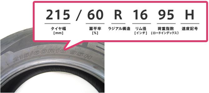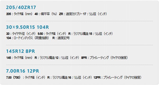 ※低偏平タイヤ・4WD車・軽貨物車・オフロード車などによって、タイヤの表記が違う場合があります。